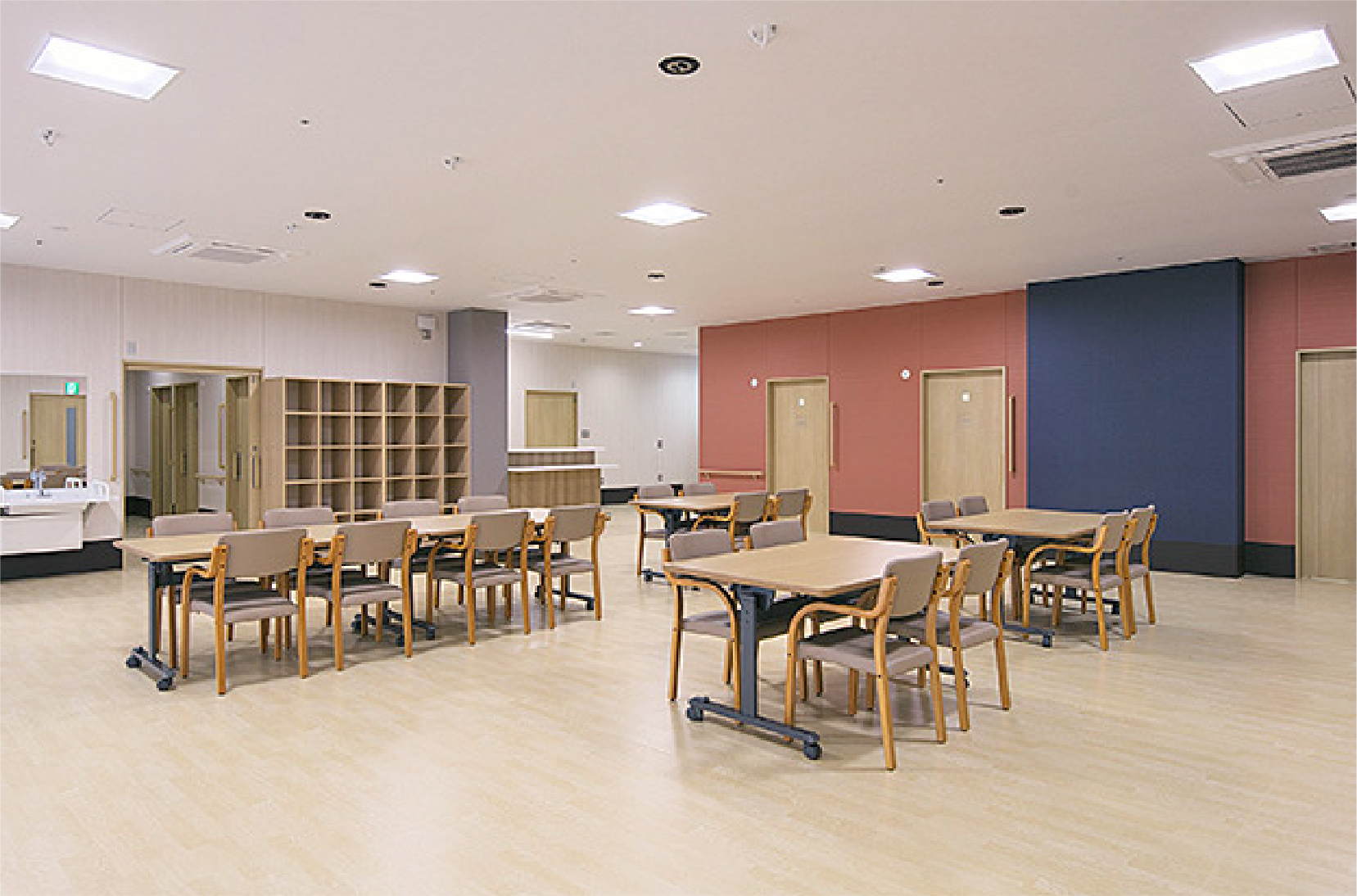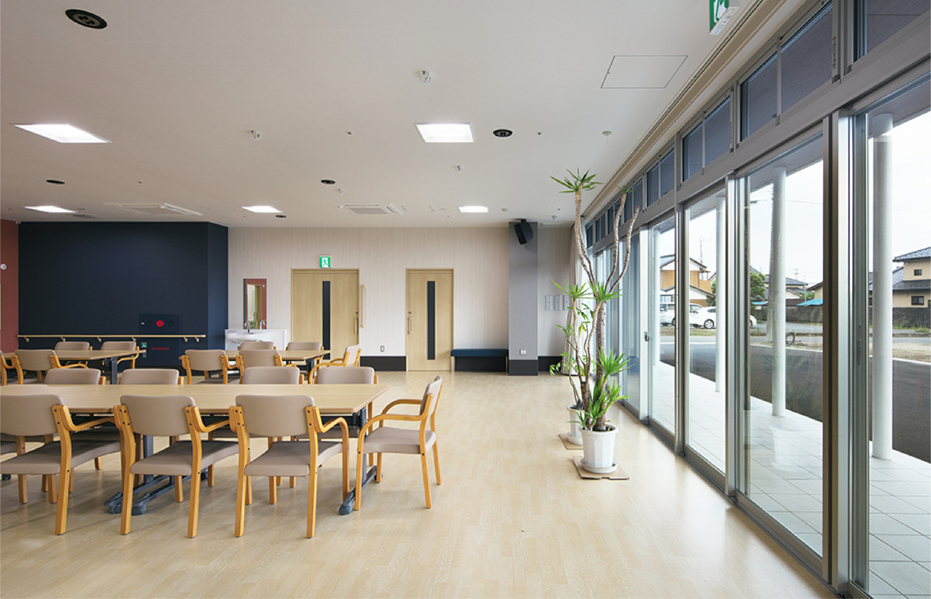 一般的な介護施設と異なるモダンなクロスを使用しており、南向きの広い窓に囲まれた陽の光が差し込む明るい空間です。食事のほか、ヨガや簡単な筋力トレーニングなど身体に合った効果的な運動が行えます。