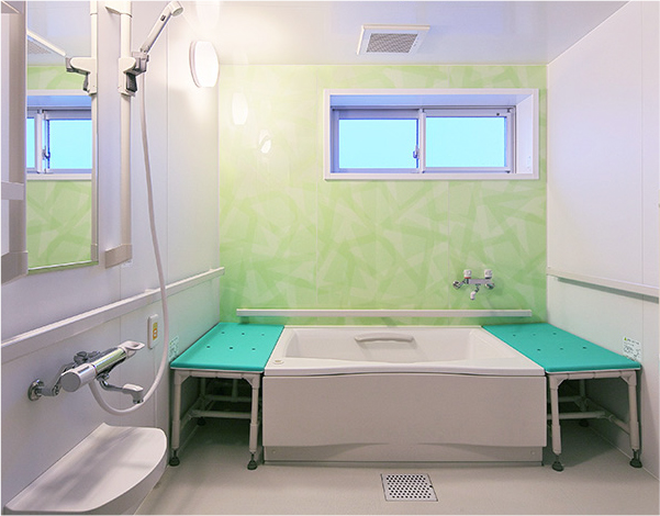 2ヶ所の個室浴室をはじめシャワーブース・機械浴室のある入浴スペースは、カーテンで仕切られプライバシーに配慮しています。ヒートショック予防のため各入浴スペースの脱衣場には床暖房を設置、また各浴室天井にも暖房設備を備えています。